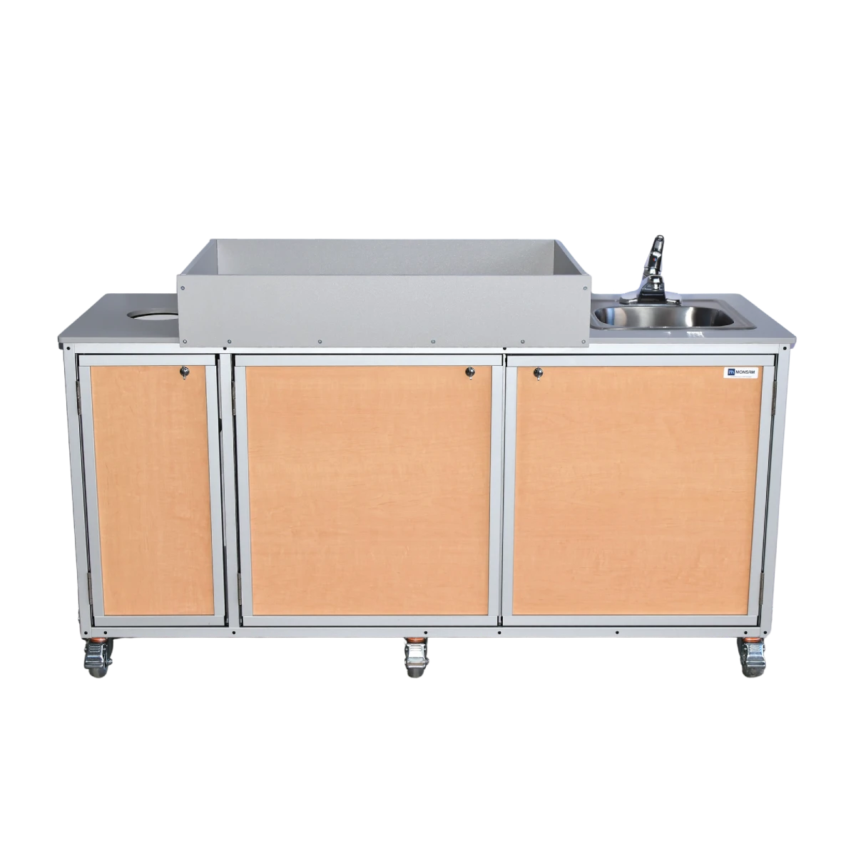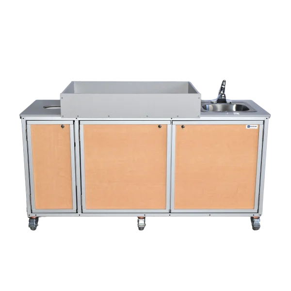 The Monsam PSE-2010E portable diaper changing table with built-in hot and cold water sink offers an enclosed, padded diaper-changing space and a spacious cabinet to store diapers, wipes, clothes, and more. The HDPE counter is easy to clean and made with antimicrobial material to help it stay germ free between changes. No assembly or plumbing required.