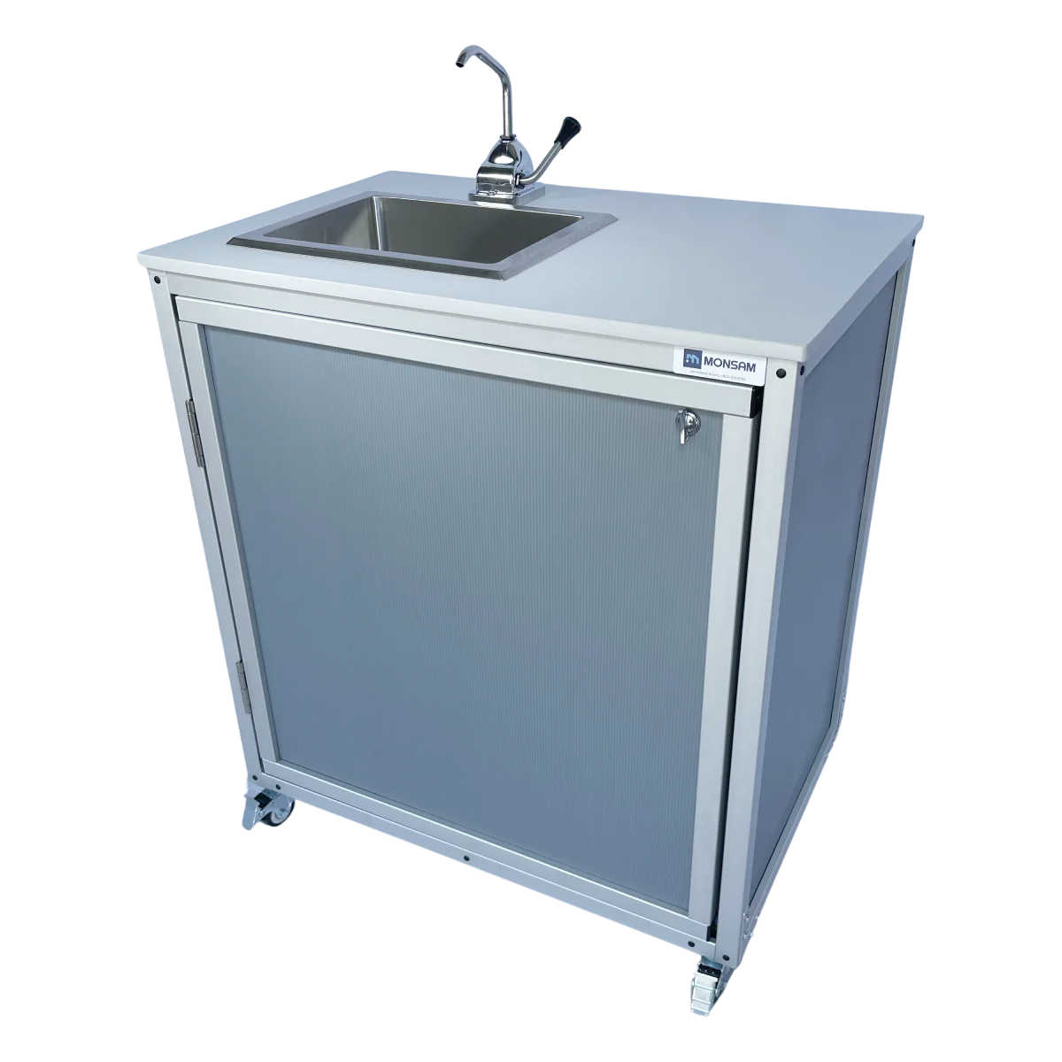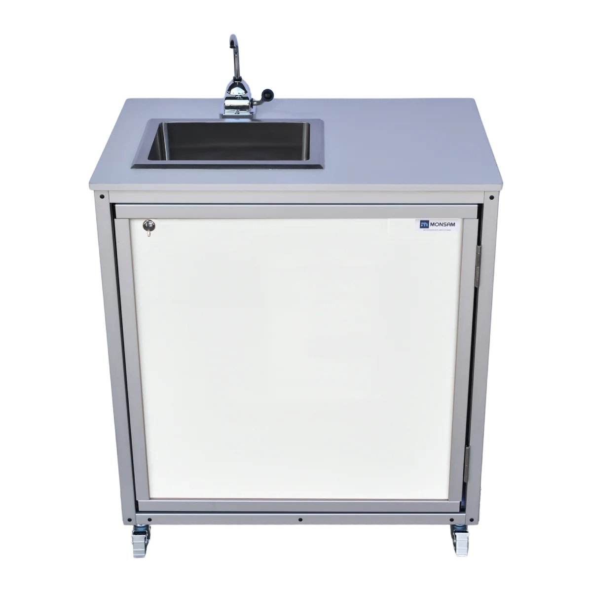 Standing at a convenient 30.25 inches and operating through a unique and simple hand pump, the Monsam PSE-2008 child-height sink does not require electricity or plumbing and provides children with a simple, accessible way to wash their hands, utensils, or even small toys indoors or outdoors. COLD WATER ONLY.