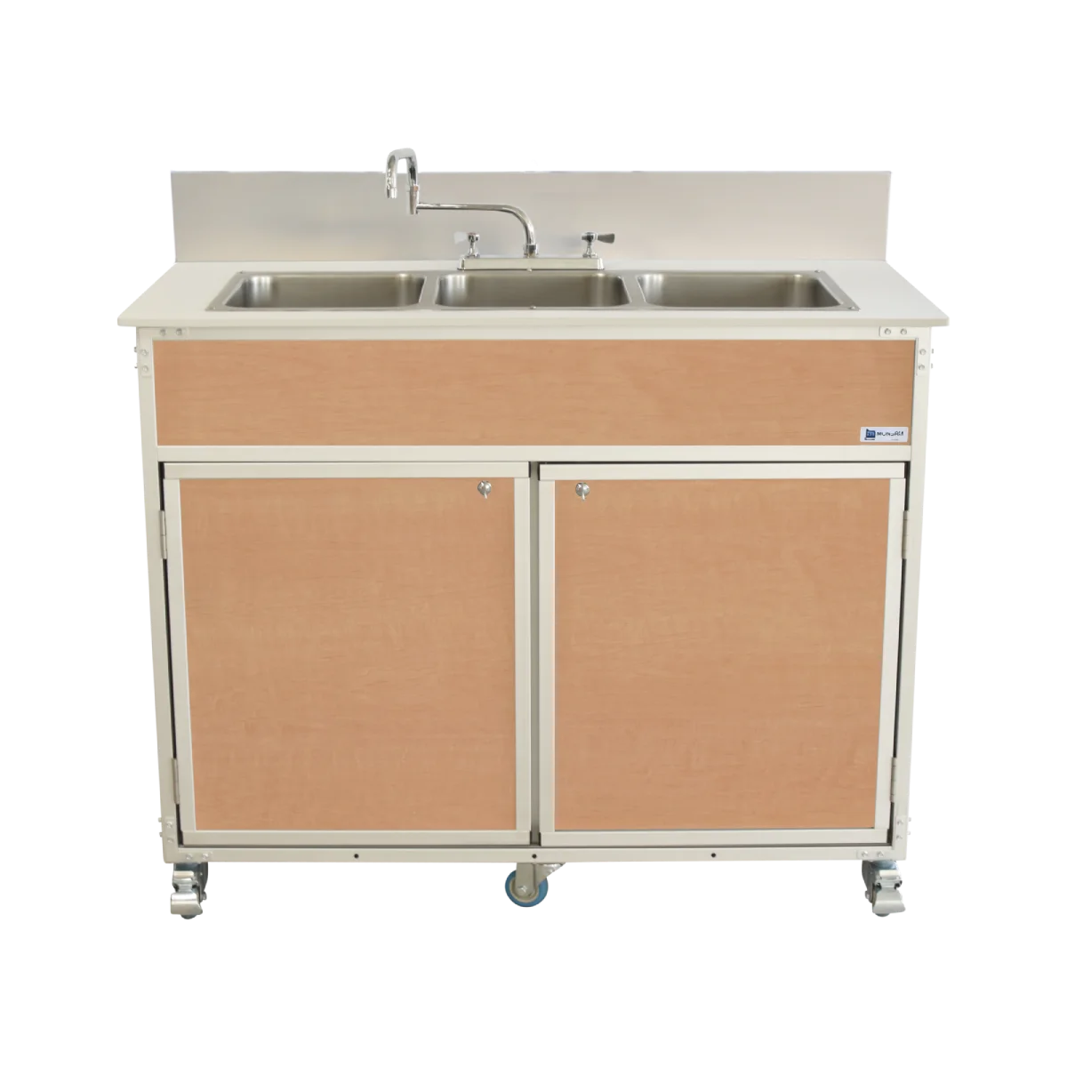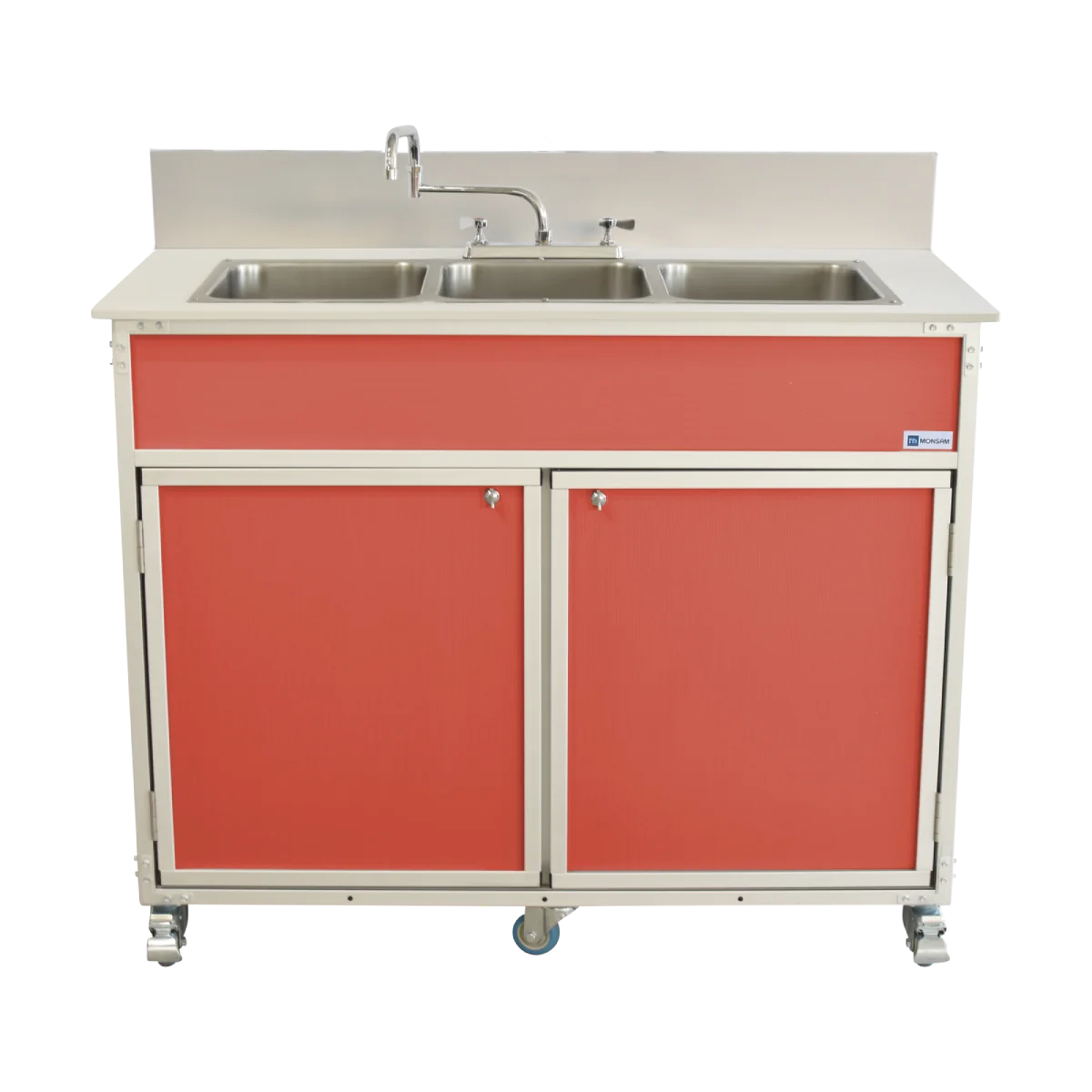 This three-compartment portable sink is a sensible solution for high traffic areas with requirements for hot and cold running water. It features three 12” deep basins to wash, rinse and sanitize cooking utensils and equipment.